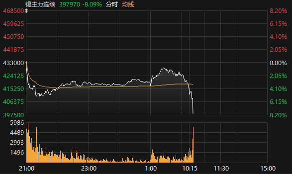 上证报中国证券网讯据Choice数据易配宝,1月16日,沪锡期货主力合约盘中跳水,截至10:38报397970元/吨,跌超8%。